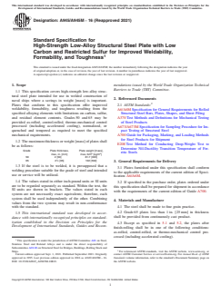 ASTM A945/A945M-16(2021) is the standard specification published by ASTM International for high-strength, low-alloy structural steel plates. These steel plates are specifically developed for welded construction applications where significant weight savings are critical, such as in naval shipbuilding. The specification emphasizes improved weldability, formability, and toughness, achieved by controlling carbon and sulfur content and restricting residual elements.