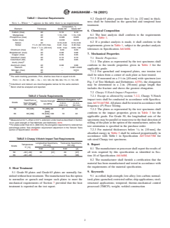 ABSTRACT This specification covers high-strength low-alloy structural steel plates intended for use in welded construction of naval ships where a savings in weight (mass) is important. The steel shall be made to fine grain practice. The plates shall optionally undergo heat treatment such as quenching or tempering to meet the requirements on mechanical properties such as yield point, yield strength, elongation, and Charpy V-notch impact, provided that the treatment be reported on the test report. The specimen shall undergo heat and product analyses and conform to the chemical composition values of carbon, manganese, phosphorus, sulfur, silicon, nickel, chromium, molybdenum, copper, vanadium, columbium, aluminum, titanium, and nitrogen. SCOPE 1.1 This specification covers high-strength low-alloy structural steel plate intended for use in welded construction of naval ships where a savings in weight [mass] is important. Plates that conform to this specification offer improved weldability, formability, and toughness resulting from the specified alloying elements with limitations on carbon, sulfur, and residual element contents. Grades 50 and 65 may be provided as-rolled, control-rolled, thermo-mechanical control processed (including accelerated cooling), normalized, or quenched and tempered as required to meet the specified mechanical requirements. 1.2 The maximum thickness or weight [mass] of plates shall be as follows: Grade Plate thickness, max, in. [mm] Plate weight [mass], max, lb/ft2 [kg/m2] 50 2 [50] 81.7 [393] 65 21/2 [65] 102 [502] 1.3 If the steel is to be welded, it is presupposed that a welding procedure suitable for the grade of steel and intended use or service will be utilized. 1.4 The values stated in either inch-pound units or SI units are to be regarded separately as standard. Within the text, the SI units are shown in brackets. The values stated in each system are not necessarily exact equivalents; therefore, each system shall be used independently of the other. Combining values from the two systems may result in non-conformance with the standard. 1.5 This international standard was developed in accordance with internationally recognized principles on standardization established in the Decision on Principles for the Development of International Standards, Guides and Recommendations issued by the World Trade Organization Technical Barriers to Trade (TBT) Committee.