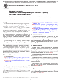 SIGNIFICANCE AND USE 4.1 This practice describes one method for accelerated weathering of pressure-sensitive tapes used primarily for packaging. It is not intended for evaluation the weathering characteristics of pressure-sensitive tapes used in long-term outdoor exposure conditions (see Practice D5105). 4.2 This practice does not necessarily provide direct simulation of natural exposure. 4.3 Results from use of this practice shall not be represented as being equivalent to those of any natural weathering test until a satisfactory degree of correlation has been established for the material in question. 4.4 Variation in results are possible when operating conditions vary within accepted limits for the instrument specified in Practices G151 and G155. SCOPE 1.1 This practice describes one environment for the exposure of pressure-sensitive tape, used primarily for packaging, to a laboratory accelerated weathering environment. 1.2 This practice describes sample preparation and the accelerated environment to which it shall be exposed. It does not specify the length of time of the exposure nor what tests shall be performed on the material following the exposure. 1.3 The values stated in either SI units or inch-pound units are to be regarded separately as standard. The values stated in each system may not be exact equivalents; therefore, each system shall be used independently of the other. Combining values from the two systems may result in non-conformance with the standard. 1.4 This standard does not purport to address all of the safety concerns, if any, associated with its use. It is the responsibility of the user of this standard to establish appropriate safety, health, and environmental practices and determine the applicability of regulatory limitations prior to use. 1.5 This international standard was developed in accordance with internationally recognized principles on standardization established in the Decision on Principles for the Development of International Standards, Guides and Recommendations issued by the World Trade Organization Technical Barriers to Trade (TBT) Committee.