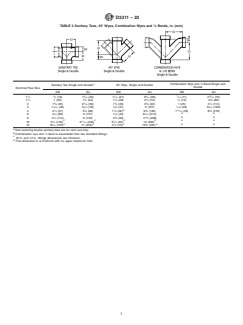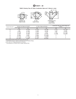 ASTM D3311-22 is a technical specification published by ASTM International. Its full title is "Standard Specification for Drain, Waste, and Vent (DWV) Plastic Fittings Patterns". This standard covers: ABSTRACT This specification illustrates the standard fitting geometries and laying lengths of plastic fittings intended for use with outside diameter controlled pipes in drain, waste, and vent (DWV) applications. SCOPE 1.1 This specification provides standard fitting geometries and laying lengths for plastic fittings intended for use in drain, waste, and vent applications. (See Specifications D2661 and D2665.) 1.2 Fittings meeting the requirements of this standard specification are designed for use with outside diameter controlled pipe. The inside diameter of pipe can vary significantly as the wall thickness and outside diameter varies and therefore is not suitable for use as a fitting socket. 1.3 The values stated in inch-pound units are to be regarded as standard. The values given in parentheses are mathematical conversions to SI units that are provided for information only and are not considered standard. 1.4 This international standard was developed in accordance with internationally recognized principles on standardization established in the Decision on Principles for the Development of International Standards, Guides and Recommendations issued by the World Trade Organization Technical Barriers to Trade (TBT) Committee.