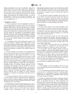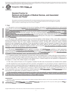 SIGNIFICANCE AND USE 5.1 The investigation of retrieved implantable medical devices and adjacent tissues can be of value in the assessment of clinical complications associated with the use of a specific prosthetic device design; can expand the knowledge of clinical implant performance and interactions between implants and the body; provide information on implant performance and safety; and thus further the development of biocompatible implant materials and devices with improved performance. Comparison of wear patterns and wear particle morphology observed with retrievals and those observed with in vitro joint simulator tests can provide valuable insight into the validity of the in vitro simulation. 5.2 A significant portion of the information associated with a retrieved implant is obtained with detailed studies of the device-tissue interface healing response. Appropriate methods are provided to facilitate a study of the particles in the tissues, and chemical analysis for the byproducts of degradation of the implant, and histologic evaluation of the cellular response to the implant. 5.3 For the analysis to be accurate, it is essential that the device and associated tissues be removed minimizing as best as possible alteration of their form and structure. It is also essential that the tissues be handled in such a way as to avoid microbial or viral contamination of the work place or the investigator. The tissue-device interface may need to be stabilized with chemical fixation prior to separation of the device from it’s in-situ position. It is also highly recommended to document detailed information about the tissue specimens, including location of extraction. Standard protocols for the examination and collection of data are provided for retrieval and handling of implantable medical devices, as well as for specific types of materials in relation to their typical applications. For particular investigational programs, additional, more specific, protocols may be required. If special analy... SCOPE 1.1 This practice covers recommendations for the retrieval, handling, and analysis of implanted medical devices and associated specimens that are removed from human and animal subjects during revision surgery and at postmortem. This practice may be used for the analysis of any implant including inert, bioactive, resorbable, and tissue engineered products. This practice can also be used for analysis of specimens and fluids from in vitro tests, including those from wear tests and joint simulators. The aim is to provide guidance to minimize iatrogenic damage during the recovery and handling of the associated specimens which could obscure the investigational results. This practice is also intended to provide guidance as to gathering data at the proper time and circumstance. 1.2 This practice offers guidelines for the analysis of retrieved implants to limit damage to them, and to allow comparisons between investigational results from different studies. The protocols are divided into three stages, where Stage I is the minimum non-destructive analysis, Stage II is more complete non-destructive analysis, and Stage III is destructive analysis. Standard protocols for the examination and collection of data are provided for specific types of materials in relation to their typical applications. For particular investigational programs, additional, more specific, protocols may be required. If special analytical techniques are employed, the appropriate handling procedures must be specified. Note that regulations for handling of patient information, tissues, and retrieved devices will vary by geography. 1.3 This practice should be applied in accordance with pertinent regulations or legal requirements regarding the handling of patient data as well as the handling and analysis of retrieved implants and excised tissues, especially with regard to handling devices which may become involved in litigation, as in accordance with Practice E...