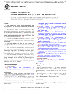 ASTM D8062-23 is the international ASTM standard specification for Purified Terephthalic Acid (PTA) with Low p-Toluic Acid content, specifically designed for use in the production of polyesters intended for superfine denier fiber applications. This document defines requirements for PTA's purity, composition, and testing methods to ensure consistent, high-quality raw materials essential in advanced polyester manufacturing. Following the guidelines of ASTM International, this standard promotes global trade, product safety, and performance by ensuring conformance to established chemical and physical properties.