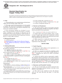 ASTM B47-95a(2017) is a technical specification published by ASTM International. Its full title is "Standard Specification for Copper Trolley Wire". This standard covers: ABSTRACT This specification covers round and grooved hard-drawn copper- and silver-bearing copper trolley wires. Copper materials shall be of such quality and purity that the finished product shall have the properties and characteristics prescribed herein. All wires shall conform to the following physical properties: tensile strength, elongation, dimensions, density, and electrical resistivity. Three twist tests shall be made on round wires between the holders of the testing machine for the purpose of determining developing defects that may be prejudicial to the life of the trolley wire. Wires that do not withstand at least nine twists without breaking shall not be considered satisfactory. The twist test shall be omitted for grooved wires. All wires shall be of uniform size, shape, and quality throughout, and shall be free from all scale, flaws, splits, and scratches not consistent with the best commercial practice. SCOPE 1.1 This specification covers round and grooved hard-drawn copper and silver-bearing copper trolley wire. 1.2 The values stated in inch-pound units are to be regarded as standard. The values given in parentheses are mathematical conversions to SI units that are provided for information only and are not considered standard. 1.3 This international standard was developed in accordance with internationally recognized principles on standardization established in the Decision on Principles for the Development of International Standards, Guides and Recommendations issued by the World Trade Organization Technical Barriers to Trade (TBT) Committee.