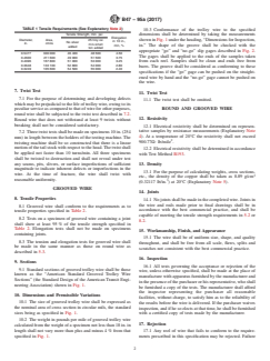 ABSTRACT This specification covers round and grooved hard-drawn copper- and silver-bearing copper trolley wires. Copper materials shall be of such quality and purity that the finished product shall have the properties and characteristics prescribed herein. All wires shall conform to the following physical properties: tensile strength, elongation, dimensions, density, and electrical resistivity. Three twist tests shall be made on round wires between the holders of the testing machine for the purpose of determining developing defects that may be prejudicial to the life of the trolley wire. Wires that do not withstand at least nine twists without breaking shall not be considered satisfactory. The twist test shall be omitted for grooved wires. All wires shall be of uniform size, shape, and quality throughout, and shall be free from all scale, flaws, splits, and scratches not consistent with the best commercial practice. SCOPE 1.1 This specification covers round and grooved hard-drawn copper and silver-bearing copper trolley wire. 1.2 The values stated in inch-pound units are to be regarded as standard. The values given in parentheses are mathematical conversions to SI units that are provided for information only and are not considered standard. 1.3 This international standard was developed in accordance with internationally recognized principles on standardization established in the Decision on Principles for the Development of International Standards, Guides and Recommendations issued by the World Trade Organization Technical Barriers to Trade (TBT) Committee.