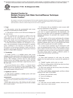 ASTM F1728-96(2020), Standard Practice for Multiple Persons Cold Water Survival/Rescue Technique: Huddle Position, is a widely recognized guideline developed by ASTM International. This standard addresses crucial procedures for maximizing survival and rescue effectiveness for multiple persons immersed in cold water. The practice is particularly targeted at situations where self-rescue is needed due to unavailability of immediate help, shoreline, boats, or floating supports. Following this standard helps organizations and individuals enhance safety, conserve body heat, and increase the chances of survival during water emergencies.
