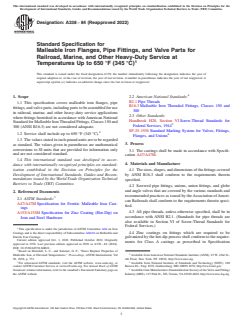 ABSTRACT This specification covers malleable iron flanges, pipe fittings, and valve parts, including parts to be assembled for use in railroad, marine, and other heavy duty service applications. The sizes, shapes, and dimensions of the fittings shall conform to the requirements specified. The iron shall be produced under constant control of chemical composition and physical properties. Records of the chemical composition of the iron and of the physical properties of the test specimens shall be systematically made and maintained. SCOPE 1.1 This specification covers malleable iron flanges, pipe fittings, and valve parts, including parts to be assembled for use in railroad, marine, and other heavy-duty service applications where fittings furnished in accordance with American National Standard for Malleable Iron Threaded Fittings, Classes 150 and 300 (ANSI B16.3) are not considered adequate. 1.2 Service shall include up to 650 °F (345 °C).2 1.3 The values stated in inch-pound units are to be regarded as standard. The values given in parentheses are mathematical conversions to SI units that are provided for information only and are not considered standard. 1.4 This international standard was developed in accordance with internationally recognized principles on standardization established in the Decision on Principles for the Development of International Standards, Guides and Recommendations issued by the World Trade Organization Technical Barriers to Trade (TBT) Committee.