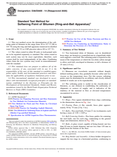 ASTM D36/D36M-14(2020) is a standard published by ASTM International. Its full title is "Standard Test Method for Softening Point of Bitumen (Ring-and-Ball Apparatus)". This standard covers: SIGNIFICANCE AND USE 4.1 Bitumens are viscoelastic materials without sharply defined melting points; they gradually become softer and less viscous as the temperature rises. For this reason, softening points must be determined by an arbitrary and closely defined method if results are to be reproducible. 4.2 The softening point is useful in the classification of bitumens, as one element in establishing the uniformity of shipments or sources of supply, and is indicative of the tendency of the material to flow at elevated temperatures encountered in service. SCOPE 1.1 This test method covers the determination of the softening point of bitumen in the range from 30 to 157 °C [86 to 315 °F] using the ring-and-ball apparatus immersed in distilled water [30 to 80 °C] or USP glycerin (above 80 to 157 °C). 1.2 The values stated in either SI units or inch-pound units are to be regarded separately as standard. The values stated in each system may not be exact equivalents; therefore, each system shall be used independently of the other. Combining values from the two systems may result in nonconformance with the standard. 1.3 This standard does not purport to address all of the safety concerns, if any, associated with its use. It is the responsibility of the user of this standard to establish appropriate safety, health, and environmental practices and determine the applicability of regulatory limitations prior to use. 1.4 This international standard was developed in accordance with internationally recognized principles on standardization established in the Decision on Principles for the Development of International Standards, Guides and Recommendations issued by the World Trade Organization Technical Barriers to Trade (TBT) Committee.