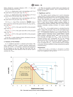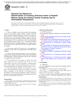 SIGNIFICANCE AND USE 5.1 The indirect tensile cracking test is used to determine asphalt mixture cracking resistance at an intermediate temperature which could range from 5 °C to 35 °C, depending on local climate. The specimens are readily obtained from Superpave gyratory compactor compacted cylinders with a diameter of 150 ± 2 mm, with no cutting, gluing, notching, drilling, or instrumentation required. Similarly, field cores can be tested to measure remaining cracking resistance of in-place asphalt mixtures. 5.2 The CTIndex of an asphalt mixture is calculated from the failure energy, the post-peak slope of the load-displacement curve, and deformation tolerance at 75 % of the peak load. The CTIndex is a performance indicator of the cracking resistance of asphalt mixtures containing various asphalt binders, asphalt binder modifiers, aggregate blends, fibers, and recycled materials. Generally, the higher the CTIndex value, the better the cracking resistance and, consequently, the less the cracking amount in the field. The range for an acceptable CTIndex will vary with mix types and associated specific applications.4 Users can employ the CTIndex and associated criteria to identify crack-prone mixtures during mix design and production quality control/assurance. Note 1: The quality of the results produced by this standard are dependent on the competence of the personnel performing the procedure and the capability, calibration, and maintenance of the equipment used. Agencies that meet the criteria of Specification D3666 are generally considered capable of competent and objective testing, sampling, inspection, etc. Users of this standard are cautioned that compliance with Specification D3666 alone does not completely ensure reliable results. Reliable results depend on many factors; following the suggestions of Specification D3666 or some similar acceptable guideline provides a means of evaluating and controlling some of those factors. SCOPE 1.1 This test method covers the procedures for preparing, testing, and measuring asphalt mixture cracking resistance using cylindrical laboratory-prepared asphalt mix samples or pavement cores. Testing temperatures are selected from the long-term pavement performance (LTPP) database intermediate temperatures. The test method describes the determination of the cracking tolerance index, CTIndex, and other parameters determined from the load-displacement curve. These parameters can be used to evaluate the resistance of asphalt mixtures to cracking. 1.2 The values stated in SI units are to be regarded as standard. No other units of measurement are included in this standard. 1.3 The text of this standard references notes and footnotes which provide explanatory material. These notes and footnotes (excluding those in tables and figures) shall not be considered as requirements of the standard. 1.4 This standard does not purport to address all of the safety concerns, if any, associated with its use. It is the responsibility of the user of this standard to establish appropriate safety, health, and environmental practices and determine the applicability of regulatory limitations prior to use. 1.5 This international standard was developed in accordance with internationally recognized principles on standardization established in the Decision on Principles for the Development of International Standards, Guides and Recommendations issued by the World Trade Organization Technical Barriers to Trade (TBT) Committee.