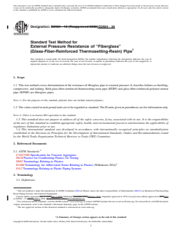 SIGNIFICANCE AND USE 5.1 The values obtained by this test method are applicable only to conditions that specifically duplicate the procedures used. 5.2 After a scaling constant is determined for one diameter, this may be used for calculating the external failure pressures of other diameters as long as the resin and reinforcement (if used), the wall thickness-to-diameter ratio, and the reinforcement pattern (if reinforcement is used) are the same. Note 3: Based upon tests conducted on one size of pipe, a scaling constant is calculated according to 10.1 or 10.2. The appropriate constant is used to calculate failure pressure for other pipe diameters, but it can only be applied if the same resin and reinforcement are used, the wall thickness to diameter ratios are similar, and the reinforcement pattern is constant. 5.3 In the application of the following test requirements and recommendations, care must be exercised to ensure that the specimens tested are truly representative of the group being studied. SCOPE 1.1 This test method covers determination of the resistance of fiberglass pipe to external pressure. It classifies failures as buckling, compressive, and leaking. Both glass-fiber-reinforced thermosetting-resin pipe (RTRP) and glass-fiber-reinforced polymer mortar pipe (RPMP) are fiberglass pipes. Note 1: For the purposes of this standard, polymer does not include natural polymers. 1.2 The values stated in inch-pound units are to be regarded as standard. The SI units given in parentheses are for information only. Note 2: There is no known ISO equivalent to this standard. 1.3 This standard does not purport to address all of the safety concerns, if any, associated with its use. It is the responsibility of the user of this standard to establish appropriate safety, health, and environmental practices and determine the applicability of regulatory limitations prior to use. 1.4 This international standard was developed in accordance with internationally recognized principles on standardization established in the Decision on Principles for the Development of International Standards, Guides and Recommendations issued by the World Trade Organization Technical Barriers to Trade (TBT) Committee.