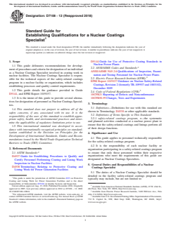 SIGNIFICANCE AND USE 4.1 This guide applies to personnel technically responsible for the safety-related coatings program. 4.2 It is the responsibility of each nuclear facility or organization participating in a safety-related coatings program to ensure that only those personnel within their respective organizations who meet the requirements of this guide are designated as Nuclear Coatings Specialists. SCOPE 1.1 This guide delineates recommendations for development of procedures and criteria for designation of an individual as a Nuclear Coatings Specialist involved in coating work in nuclear facilities. The Nuclear Coatings Specialist is responsible for the technical aspects of the safety-related coatings program in a nuclear facility or organization, which includes establishing processes and quality control requirements. 1.2 This guide details the guidance provided in Guide D5144, and EPRI Report 1019157. 1.3 It is the intent of this guide to provide several alternatives for designation of personnel as Nuclear Coatings Specialists. 1.4 This standard does not purport to address all of the safety concerns, if any, associated with its use. It is the responsibility of the user of this standard to establish appropriate safety, health, and environmental practices and determine the applicability of regulatory limitations prior to use. 1.5 This international standard was developed in accordance with internationally recognized principles on standardization established in the Decision on Principles for the Development of International Standards, Guides and Recommendations issued by the World Trade Organization Technical Barriers to Trade (TBT) Committee.