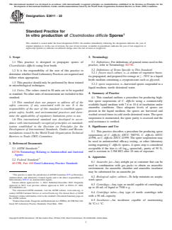 ASTM E3011-22 is a standard published by ASTM International. Its full title is "Standard Practice for In vitro production of <emph type="ital">Clostridioides difficile</emph > Spores". This standard covers: SIGNIFICANCE AND USE 5.1 This practice describes a procedure for producing spore suspensions of C. difficile ATCC 700792, C. difficile ATCC 43598, or C. difficile ATCC 43599. The spore suspensions may be used in antimicrobial efficacy testing, or other laboratory testing requiring C. difficile spores. A spore crop is considered acceptable if the titer is >8 log10 spores/mL, purity of 95 %, and is resistant to 2.5M HCl after 10 min of exposure. SCOPE 1.1 This practice is designed to propagate spores of Clostridioides difficile using liver broth. 1.2 It is the responsibility of the user of this practice to determine whether Good Laboratory Practices are required and follow when appropriate. 1.3 This practice should only be performed by those trained in microbiological techniques. 1.4 Units—The values stated in SI units are to be regarded as standard. No other units of measurement are included in this standard. 1.5 This standard does not purport to address all of the safety concerns, if any, associated with its use. It is the responsibility of the user of this standard to establish appropriate safety, health, and environmental practices and determine the applicability of regulatory limitations prior to use. 1.6 This international standard was developed in accordance with internationally recognized principles on standardization established in the Decision on Principles for the Development of International Standards, Guides and Recommendations issued by the World Trade Organization Technical Barriers to Trade (TBT) Committee.