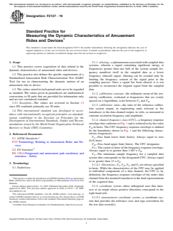 ASTM F2137-19 is a standard published by ASTM International. Its full title is "Standard Practice for Measuring the Dynamic Characteristics of Amusement Rides and Devices". This standard covers: SIGNIFICANCE AND USE 4.1 This practice is intended for use whenever the dynamic characteristics of an amusement ride or device are to be determined. The existence of this practice is not intended to imply that there is a requirement to perform specific testing on amusement rides or devices. 4.2 The general provisions of this practice provide instrumentation specifications, data acquisition and testing procedures, and documentation requirements that when applied will improve the repeatability, reliability, and utility of the test results. 4.3 Based on the general provisions of this practice, the SARC Test specifications, when followed, will yield standardized test results regarding the patron-related, dynamic motion of amusement rides or devices. The SARC Test will facilitate both the meaningful comparison of the dynamic motion of different amusement rides or devices and the tracking of changes, if any, in the dynamic characteristics of a given ride or device. SCOPE 1.1 This practice covers acquisition of data related to the dynamic characteristics of amusement rides and devices. 1.2 This practice also defines the specific requirements of a Standardized Amusement Ride Characterization Test (SARC Test) for use in characterizing the dynamic motion of an amusement ride or device. 1.3 The values stated in inch-pound units are to be regarded as standard. The values given in parentheses are mathematical conversions to SI units that are provided for information only and are not considered standard. 1.3.1 Exception—The values are reversed in Section 13 since EN standards primarily use SI units. 1.4 This international standard was developed in accordance with internationally recognized principles on standardization established in the Decision on Principles for the Development of International Standards, Guides and Recommendations issued by the World Trade Organization Technical Barriers to Trade (TBT) Committee.