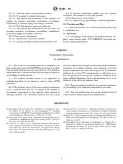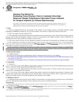 SIGNIFICANCE AND USE 4.1 Published literature shows that the yield of radiolytic reactions that occur during radiation treatment increases with radiation dose level. Measurement of the products of these reactions can be used as an internal dosimeter. 4.2 Trans-vinylene unsaturations are formed during ionization treatment by abstraction of a hydrogen molecule, and to a lesser extent by the recombination of two adjacent alkyl free radicals that reside on the same chain. 4.3 Previous work generated calibration curves of trans-vinylene absorption area as a function of absorbed radiation dose, yielding a linear relationship for both gamma- and electron beam-irradiated polyethylene. 4.4 This data can be used to determine received dose as a function of position, assuming a calibration curve (TVI versus radiation dose level) is known for the particular material and radiation conditions used, and can be used to determine uniformity of dose level in irradiated polyethylene. SCOPE 1.1 This test method describes the measurement of the number of trans-vinylene groups in ultra-high molecular weight polyethylene (UHMWPE) intended for use in medical implants. The material is analyzed by infrared spectroscopy. 1.2 This test method is based on Guide F2102. 1.3 The applicability of the infrared method has been demonstrated in other literature reports. This particular method, using the intensity (area) of the C-H absorption centered at 1370 cm-1 to normalize for the sample’s thickness, will be validated by an Interlaboratory Study (ILS) conducted according to Practice E691. 1.4 The values stated in SI units are to be regarded as standard. No other units of measurement are included in this standard. 1.5 This standard does not purport to address all of the safety concerns, if any, associated with its use. It is the responsibility of the user of this standard to establish appropriate safety, health, and environmental practices and determine the applicability of regulatory limitations prior to use. 1.6 This international standard was developed in accordance with internationally recognized principles on standardization established in the Decision on Principles for the Development of International Standards, Guides and Recommendations issued by the World Trade Organization Technical Barriers to Trade (TBT) Committee.