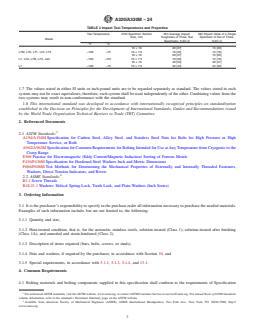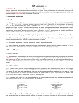 ABSTRACT This specification covers alloy steel bolting materials for pressure vessels, valves, flanges, and fittings for low-temperature service. Each alloy shall conform to the prescribed chemical composition requirements. The material, as represented by the tension specimens, shall conform to the requirements as to tensile properties such as tensile strength, yield strength, elongation, and hardness. The material shall meet the prescribed impact energy absorption requirements and the recommended test temperature. Mechanical tests shall be conducted on the material, namely: impact testing, tension testing, and hardness testing. SCOPE 1.1 This specification2 covers alloy and stainless steel bolting materials and bolting components for pressure vessels, valves, flanges, and fittings for low-temperature service. See Specification A962/A962M for the definition of bolting. The bars shall be hot-wrought and may be further processed by centerless grinding or by cold drawing. Austenitic stainless steel may be solution annealed or annealed and strain-hardened. When strain hardened austenitic stainless steel is ordered, the purchaser should take special care to ensure that Appendix X1 is thoroughly understood. 1.2 Several grades are covered, including both ferritic and austenitic steels designated L7, B8, etc. Selection will depend on design, service conditions, mechanical properties, and low-temperature characteristics. The mechanical requirements of Table 1 indicate the diameters for which the minimum mechanical properties apply to the various grades and classes, and Table 2 stipulates the requirements for Charpy impact energy absorption. The manufacturer should determine that the material can conform to these requirements before parts are manufactured. For example, when Grade L43 is specified to meet the Table 2 impact energy values at −150 °F [−101 °C], additional restrictions (such as procuring a steel with lower P and S contents than might normally be supplied) in the chemical composition for AISI 4340 are likely to be required. Note 1: The committee formulating this specification has included several grades of material that have been rather extensively used for the present purpose. Other compositions will be considered for inclusion by the committee from time to time as the need becomes apparent. Users should note that hardenability of some of the grades mentioned may restrict the maximum size at which the required mechanical properties are obtainable. 1.3 The following referenced general requirements are indispensable for application of this specification: Specification A962/A962M. 1.4 Nuts for use with bolting are covered in Section 10 and the nut material shall be impact tested. 1.5 Supplementary Requirements are provided for use at the option of the purchaser. The supplementary requirements shall apply only when specified in the purchase order or contract. 1.6 This specification is expressed in both inch-pound units and SI units; however, unless the purchase order or contract specifies the applicable M specification designation (SI) units, the inch-pound units shall apply. 1.7 The values stated in either SI units or inch-pound units are to be regarded separately as standard. The values stated in each system may not be exact equivalents; therefore, each system shall be used independently of the other. Combining values from the two systems may result in non-conformance with the standard. 1.8 This international standard was developed in accordance with internationally recognized principles on standardization established in the Decision on Principles for the Development of International Standards, Guides and Recommendations issued by the World Trade Organization Technical Barriers to Trade (TBT) Committee.