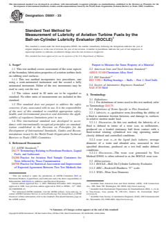 ASTM D5001-23 is a standard published by ASTM International. Its full title is "Standard Test Method for Measurement of Lubricity of Aviation Turbine Fuels by the Ball-on-Cylinder Lubricity Evaluator (BOCLE)". This standard covers: SIGNIFICANCE AND USE 5.1 Wear due to excessive friction resulting in shortened life of engine components such as fuel pumps and fuel controls has sometimes been ascribed to lack of lubricity in an aviation fuel. 5.2 The relationship of test results to aviation fuel system component distress due to wear has been demonstrated for some fuel/hardware combinations where boundary lubrication is a factor in the operation of the component. 5.3 The wear scar generated in the ball-on-cylinder lubricity evaluator (BOCLE) test is sensitive to contamination of the fluids and test materials, the presence of oxygen and water in the atmosphere, and the temperature of the test. Lubricity measurements are also sensitive to trace materials acquired during sampling and storage. Containers specified in Practice D4306 shall be used. 5.4 The BOCLE test method may not directly reflect operating conditions of engine hardware. For example, some fuels that contain a high content of certain sulfur compounds can give anomalous test results. SCOPE 1.1 This test method covers assessment of the wear aspects of the boundary lubrication properties of aviation turbine fuels on rubbing steel surfaces. 1.1.1 This test method incorporates two procedures, one using a semi-automated instrument and the second a fully automated instrument. Either of the two instruments may be used to carry out the test. 1.2 The values stated in SI units are to be regarded as standard. No other units of measurement are included in this standard. 1.3 This standard does not purport to address the safety concerns, if any, associated with its use. It is the responsibility of the user of this standard to establish appropriate safety, health, and environmental practices and determine the applicability of regulatory limitations prior to use. 1.4 This international standard was developed in accordance with internationally recognized principles on standardization established in the Decision on Principles for the Development of International Standards, Guides and Recommendations issued by the World Trade Organization Technical Barriers to Trade (TBT) Committee.