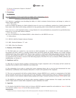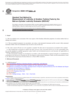 SIGNIFICANCE AND USE 5.1 Wear due to excessive friction resulting in shortened life of engine components such as fuel pumps and fuel controls has sometimes been ascribed to lack of lubricity in an aviation fuel. 5.2 The relationship of test results to aviation fuel system component distress due to wear has been demonstrated for some fuel/hardware combinations where boundary lubrication is a factor in the operation of the component. 5.3 The wear scar generated in the ball-on-cylinder lubricity evaluator (BOCLE) test is sensitive to contamination of the fluids and test materials, the presence of oxygen and water in the atmosphere, and the temperature of the test. Lubricity measurements are also sensitive to trace materials acquired during sampling and storage. Containers specified in Practice D4306 shall be used. 5.4 The BOCLE test method may not directly reflect operating conditions of engine hardware. For example, some fuels that contain a high content of certain sulfur compounds can give anomalous test results. SCOPE 1.1 This test method covers assessment of the wear aspects of the boundary lubrication properties of aviation turbine fuels on rubbing steel surfaces. 1.1.1 This test method incorporates two procedures, one using a semi-automated instrument and the second a fully automated instrument. Either of the two instruments may be used to carry out the test. 1.2 The values stated in SI units are to be regarded as standard. No other units of measurement are included in this standard. 1.3 This standard does not purport to address the safety concerns, if any, associated with its use. It is the responsibility of the user of this standard to establish appropriate safety, health, and environmental practices and determine the applicability of regulatory limitations prior to use. 1.4 This international standard was developed in accordance with internationally recognized principles on standardization established in the Decision on Principles for the Development of International Standards, Guides and Recommendations issued by the World Trade Organization Technical Barriers to Trade (TBT) Committee.