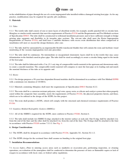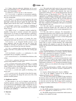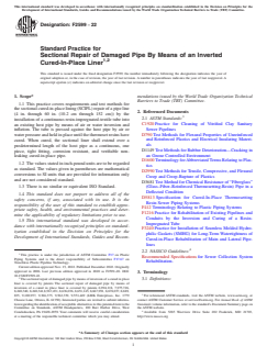 ASTM F2599-22 is a standard published by ASTM International. Its full title is "Standard Practice for Sectional Repair of Damaged Pipe By Means of an Inverted Cured-In-Place Liner<rangeref></rangeref >". This standard covers: SIGNIFICANCE AND USE 4.1 This practice is for use by designers and specifiers, regulatory agencies, owners, and inspection organizations who are involved in the rehabilitation of pipes through the use of a resin-impregnated tube installed within a damaged existing host pipe. As for any practice, modifications may be required for specific job conditions. SCOPE 1.1 This practice covers requirements and test methods for the sectional cured-in-place lining (SCIPL) repair of a pipe line (4 in. through 60 in. (10.2 cm through 152 cm)) by the installation of a continuous resin-impregnated-textile tube into an existing host pipe by means of air or water inversion and inflation. The tube is pressed against the host pipe by air or water pressure and held in place until the thermoset resins have cured. When cured, the sectional liner shall extend over a predetermined length of the host pipe as a continuous, one piece, tight fitting, corrosion resistant, and verifiable non-leaking cured-in-place pipe. 1.2 The values stated in inch-pound units are to be regarded as standard. The values given in parentheses are mathematical conversions to SI units that are provided for information only and are not considered standard. 1.3 There is no similar or equivalent ISO Standard. 1.4 This standard does not purport to address all of the safety concerns, if any, associated with its use. It is the responsibility of the user of this standard to establish appropriate safety, health, and environmental practices and determine the applicability of regulatory limitations prior to use. 1.5 This international standard was developed in accordance with internationally recognized principles on standardization established in the Decision on Principles for the Development of International Standards, Guides and Recommendations issued by the World Trade Organization Technical Barriers to Trade (TBT) Committee.