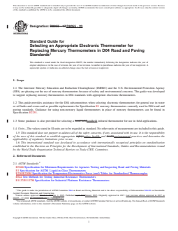 SIGNIFICANCE AND USE 4.1 General guidance is provided for electronic thermometers for general temperature measurements typically needed for D04 practices and test methods which need to monitor oven, water and oil bath, and material temperatures during drying, heating, aging, and mixing. 4.2 All ASTM standards under the management of the D04 Main Committee were individually reviewed, and a list of all Specification E1 mercury thermometers was prepared along with the required temperature range and information about the thermometer placement in each method. 4.2.1 This specific information was used to identify the most appropriate type(s) of electronic thermometers which can be used to replace mercury thermometers in the current D04 road and paving standards. SCOPE 1.1 The Interstate Mercury Education and Reduction Clearinghouse (IMERC) and the U.S. Environmental Protection Agency (EPA) are phasing out the use of mercury thermometers because of safety and environmental concerns. This guide was developed to support replacing mercury thermometers in D04 standards with appropriate electronic thermometers. 1.2 This guide provides assistance for the D04 subcommittees when selecting electronic thermometers for general use in water or oil baths and ovens and as possible replacements for Specification E1 mercury thermometers currently used in D04 road and paving standards. Guidance for using non-mercury liquid thermometers in place of mercury thermometers can be found in Specification E2251. 1.3 Some guidance is also provided for selecting a handheld infrared thermometer for use in field applications. 1.4 Units—The values stated in SI units are to be regarded as standard. No other units of measurement are included in this guide. 1.5 This standard does not purport to address all of the safety concerns, if any, associated with its use. It is the responsibility of the user of this standard to establish appropriate safety, health, and environmental practices and determine the applicability of regulatory limitations prior to use. 1.6 This international standard was developed in accordance with internationally recognized principles on standardization established in the Decision on Principles for the Development of International Standards, Guides and Recommendations issued by the World Trade Organization Technical Barriers to Trade (TBT) Committee.