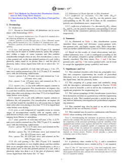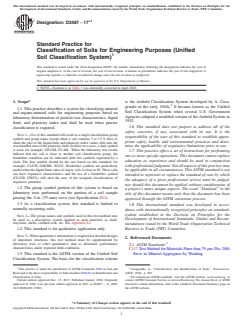 SIGNIFICANCE AND USE 5.1 This standard classifies soils from any geographic location into categories representing the results of prescribed laboratory tests to determine the particle-size characteristics, the liquid limit, and the plasticity index. 5.2 The assigning of a group name and symbol(s) along with the descriptive information required in Practice D2488 can be used to describe a soil to aid in the evaluation of its significant properties for engineering use. 5.3 The various groupings of this classification system have been devised to correlate in a general way with the engineering behavior of soils. This standard provides a useful first step in any field or laboratory investigation for geotechnical engineering purposes. 5.4 This standard may also be used as an aid in training personnel in the use of Practice D2488. 5.5 This standard may be used in combination with Practice D4083 when working with frozen soils. Note 5: Notwithstanding the statements on precision and bias contained in this standard: The precision of this test method is dependent on the competence of the personnel performing it and the suitability of the equipment and facilities used. Agencies that meet the criteria of Practice D3740 are generally considered capable of competent and objective testing. Users of this test method are cautioned that compliance with Practice D3740 does not in itself assure reliable testing. Reliable testing depends on several factors; Practice D3740 provides a means for evaluating some of those factors. SCOPE 1.1 This practice describes a system for classifying mineral and organo-mineral soils for engineering purposes based on laboratory determination of particle-size characteristics, liquid limit, and plasticity index and shall be used when precise classification is required. Note 1: Use of this standard will result in a single classification group symbol and group name except when a soil contains 5 to 12 % fines or when the plot of the liquid limit and plasticity index values falls into the crosshatched area of the plasticity chart. In these two cases, a dual symbol is used, for example, GP-GM, CL-ML. When the laboratory test results indicate that the soil is close to another soil classification group, the borderline condition can be indicated with two symbols separated by a slash. The first symbol should be the one based on this standard, for example, CL/CH, GM/SM, SC/CL. Borderline symbols are particularly useful when the liquid limit value of clayey soils is close to 50. These soils can have expansive characteristics and the use of a borderline symbol (CL/CH, CH/CL) will alert the user of the assigned classifications of expansive potential. 1.2 The group symbol portion of this system is based on laboratory tests performed on the portion of a soil sample passing the 3-in. (75-mm) sieve (see Specification E11). 1.3 As a classification system, this standard is limited to naturally occurring soils. Note 2: The group names and symbols used in this test method may be used as a descriptive system applied to such materials as shale, claystone, shells, crushed rock, etc. See Appendix X2. 1.4 This standard is for qualitative application only. Note 3: When quantitative information is required for detailed designs of important structures, this test method must be supplemented by laboratory tests or other quantitative data to determine performance characteristics under expected field conditions. 1.5 This standard is the ASTM version of the Unified Soil Classification System. The basis for the classification scheme is the Airfield Classification System developed by A. Casagrande in the early 1940s.2 It became known as the Unified Soil Classification System when several U.S. Government Agencies adopted a modified version of the Airfield System in 1952. 1.6 This standard does not purport to address all of the safety concerns, if any, associated with its use. It is the responsibility of...