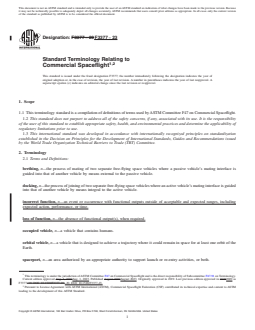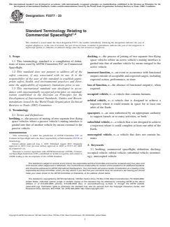 ASTM F3377-23 is a standard published by ASTM International. Its full title is "Standard Terminology Relating to Commercial Spaceflight". This standard covers: SCOPE 1.1 This terminology standard is a compilation of definitions of terms used by ASTM Committee F47 on Commercial Spaceflight. 1.2 This standard does not purport to address all of the safety concerns, if any, associated with its use. It is the responsibility of the user of this standard to establish appropriate safety, health, and environmental practices and determine the applicability of regulatory limitations prior to use. 1.3 This international standard was developed in accordance with internationally recognized principles on standardization established in the Decision on Principles for the Development of International Standards, Guides and Recommendations issued by the World Trade Organization Technical Barriers to Trade (TBT) Committee.
