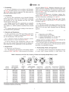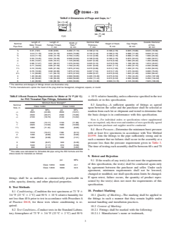 ABSTRACT This specification covers poly(vinyl chloride) (PVC) threaded Schedule 80 pipe fittings, which are PVC 12454, 12454, 13354, 11443, and 14333. The pipe fittings are intended for use with the distribution of pressurized liquids only, which are chemically compatible with the piping materials. The materials shall conform to the required dimensions and burst pressure limits. SCOPE 1.1 This specification covers poly(vinyl chloride) (PVC) threaded Schedule 80 pipe fittings. Included are requirements for materials, workmanship, dimensions, and burst pressure. Note 1: Threaded CPVC plastic pipe fittings, Schedule 80, which were formerly included in this standard, are now covered by Specification F437. 1.2 The products covered by this specification are intended for use with the distribution of pressurized liquids only, which are chemically compatible with the piping materials. Due to inherent hazards associated with testing components and systems with compressed air or other compressed gases some manufacturers do not allow pneumatic testing of their products. Consult with specific product/component manufacturers for their specific testing procedures prior to pneumatic testing. Note 2: Pressurized (compressed) air or other compressed gases contain large amounts of stored energy which present serious safety hazards should a system fail for any reason. 1.3 The text of this specification references notes, footnotes, and appendixes which provide explanatory material. These notes and footnotes (excluding those in tables and figures) shall not be considered as requirements of the specification. 1.4 The values stated in inch-pound units are to be regarded as the standard. The values given in parentheses are provided for information only. 1.5 The following safety hazards caveat pertains only to the test method portion, Section 8, of this specification. This standard does not purport to address all of the safety concerns, if any, associated with its use. It is the responsibility of the user of this standard to establish appropriate safety, health, and environmental practices and determine the applicability of regulatory limitations prior to use. 1.6 This international standard was developed in accordance with internationally recognized principles on standardization established in the Decision on Principles for the Development of International Standards, Guides and Recommendations issued by the World Trade Organization Technical Barriers to Trade (TBT) Committee.