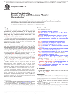 ASTM D2130-22 is a standard published by ASTM International. Its full title is "Standard Test Method for Diameter of Wool and Other Animal Fibers by Microprojection". This standard covers: SIGNIFICANCE AND USE 5.1 This test method specifies a sampling and testing procedure for the measurement of average fiber diameter and variation in diameter of animal fibers as required in Test Method D2968. 5.2 Test Method D2130 for testing wool and other animal fibers for average fiber diameter is considered satisfactory for acceptance testing of commercial shipments since current estimates of between-laboratory precision are acceptable and the method has been used extensively in the trade for acceptance testing. In cases of disagreement arising from differences in values reported by the purchaser and the seller when using this method for acceptance testing, the statistical bias, if any, between the laboratory of the purchaser and the laboratory of the seller should be determined with each comparison being based on the testing of specimens randomly drawn from one sample of material of the type being evaluated. SCOPE 1.1 This test method covers a procedure, using the microprojector, for the determination of the average fiber diameter and the fiber diameter variation on wool and other animal fibers, such as mohair, cashmere, alpaca, camel's hair, etc. (Note 1) in their various forms. 1.2 The values stated in inch-pound units are to be regarded as standard. The values given in parentheses are mathematical conversions to SI units that are provided for information only and are not considered standard. Note 1: This test method may also be applied to any fibers having a round cross section and accordingly may be used many times for melt-spun man-made fibers such as polyamides, polyesters, and glass; also it may be applied to a limited number of polyacrylics and regenerated cellulose type fibers. The values given in Appendix X1 for density and correction factors, however, apply only to wool and should not be used for other fibers. For suitable values for the density of other fibers, see Table 5 in Test Methods D629, Quantitative Analysis of Textiles. Note 2: In subsequent sections of this test method, the term “wool” also signifies mohair or other fibers if the circumstances are applicable. Note 3: For fineness specifications for wool, wool top, mohair, mohair top, alpaca, and cashmere, refer to Specifications D3991 and D3992, Specification D2252, Test Method D2816. 1.3 This standard does not purport to address all of the safety concerns, if any, associated with its use. It is the responsibility of the user of this standard to establish appropriate safety, health, and environmental practices and determine the applicability of regulatory limitations prior to use. 1.4 This international standard was developed in accordance with internationally recognized principles on standardization established in the Decision on Principles for the Development of International Standards, Guides and Recommendations issued by the World Trade Organization Technical Barriers to Trade (TBT) Committee.