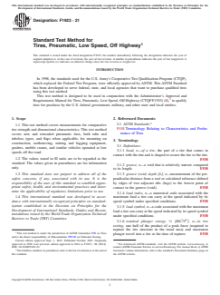 Keywords: ASTM F1923-21, pneumatic tires, off-highway tires, tire test method, tire strength, dimensional measurement, construction equipment tires, mining tire standards, CATL, CTQP, tire procurement standards.