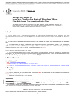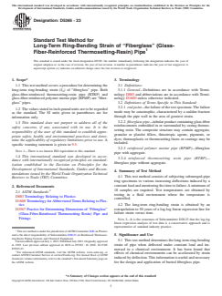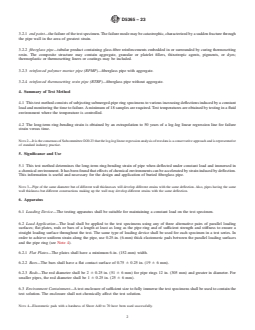 SIGNIFICANCE AND USE 5.1 This test method determines the long-term ring-bending strain of pipe when deflected under constant load and immersed in a chemical environment. It has been found that effects of chemical environments can be accelerated by strain induced by deflection. This information is useful and necessary for the design and application of buried fiberglass pipe. Note 3: Pipe of the same diameter but of different wall thicknesses will develop different strains with the same deflection. Also, pipes having the same wall thickness but different constructions making up the wall may develop different strains with the same deflection. SCOPE 1.1 This test method covers a procedure for determining the long-term ring-bending strain (Sb) of “fiberglass” pipe. Both glass-fiber-reinforced thermosetting-resin pipe (RTRP) and glass-fiber-reinforced polymer mortar pipe (RPMP) are “fiberglass” pipes. 1.2 The values stated in inch-pound units are to be regarded as the standard. The SI units given in parentheses are for information only. 1.3 This standard does not purport to address all of the safety concerns, if any, associated with its use. It is the responsibility of the user of this standard to establish appropriate safety, health, and environmental practices and determine the applicability of regulatory limitations prior to use. A specific warning statement is given in 9.5. Note 1: There is no known ISO equivalent to this standard. 1.4 This international standard was developed in accordance with internationally recognized principles on standardization established in the Decision on Principles for the Development of International Standards, Guides and Recommendations issued by the World Trade Organization Technical Barriers to Trade (TBT) Committee.