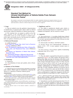 ASTM D2621-87(2016), issued by ASTM International, specifies the Standard Test Method for Infrared Identification of Vehicle Solids from Solvent-Reducible Paints. This recognized analytical method details procedures for the qualitative characterization and identification of separated paint vehicle solids using infrared (IR) spectroscopy. By comparing the infrared spectra of unknown samples to reference spectra, users can determine the type of paint vehicle present in solvent-reducible paints. This standard supports quality assurance, research, complaint investigations, and process control in the coatings and paint industry.