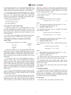 • Calculation Methods: Explicit formulas are provided for calculating amine values based on titrant volume, normality, and specimen weight. These calculations are integral for determining the composition and quality of fatty amine samples.