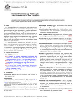 ASTM F747-23 is a standard published by ASTM International. Its full title is "Standard Terminology Relating to Amusement Rides and Devices". This standard covers: SCOPE 1.1 This terminology is a repository of terms approved by Committee F24 and its subcommittees. Reproducing terms approved within all other individual F24 standards and guides, this terminology will provide a single location where terms related to amusement rides and devices are freely accessible to the public, committee members and can be maintained, updated and utilized as effective communication tools. Although published alphabetically, terms unique to a specific F24 standard or guide are indicated as such by the reference which follows the applicable term. 1.2 This international standard was developed in accordance with internationally recognized principles on standardization established in the Decision on Principles for the Development of International Standards, Guides and Recommendations issued by the World Trade Organization Technical Barriers to Trade (TBT) Committee.