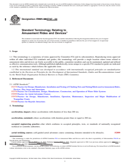 SCOPE 1.1 This terminology is a repository of terms approved by Committee F24 and its subcommittees. Reproducing terms approved within all other individual F24 standards and guides, this terminology will provide a single location where terms related to amusement rides and devices are freely accessible to the public, committee members and can be maintained, updated and utilized as effective communication tools. Although published alphabetically, terms unique to a specific F24 standard or guide are indicated as such by the reference which follows the applicable term. 1.2 This international standard was developed in accordance with internationally recognized principles on standardization established in the Decision on Principles for the Development of International Standards, Guides and Recommendations issued by the World Trade Organization Technical Barriers to Trade (TBT) Committee.