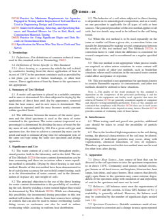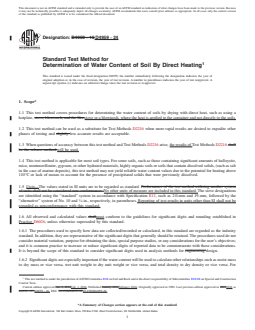 SIGNIFICANCE AND USE 5.1 The water content of a soil is used throughout professional practice both in the laboratory and in the field. The use of Test Methods D2216 for water content determination can be time consuming and there are occasions when a more expedient method is desirable. Drying by direct heating is one such method. Results of this test method have been demonstrated to be of satisfactory accuracy for use in field control testing, such as in the determination of water content, and in the determination of in-place dry unit weight of soils. 5.2 The principal objection to the use of the direct heating for water content determination is the possibility of overheating the soil, thereby yielding a water content higher than would be determined by Test Methods D2216. While not eliminating this possibility, the incremental drying procedure in this test method will reduce its effects. Some heat sources have settings or controls that can also be used to reduce overheating. Loose fitting covers or enclosures can also be used to reduce overheating while assisting in uniform heat distribution. 5.3 The behavior of a soil when subjected to direct heating is dependent on its mineralogical composition, and as a result, no one procedure is applicable for all types of soils or heat sources. The general procedure of this test method applies to all soils, but test details may need to be tailored to the soil being tested. 5.4 When this test method is to be used repeatedly on the same or similar soil from a given site, a correction factor can usually be determined by making several comparisons between the results of this test method and Test Methods D2216. A correction factor is valid when the difference is consistent for several comparisons, and is reconfirmed on a regular specified basis. 5.5 This test method is not appropriate when precise results are required, or when minor variations in water content will affect the results of other test methods, such as borderline situations where... SCOPE 1.1 This test method covers procedures for determining the water content of soils by drying with direct heat, such as using a hotplate, stove or a blowtorch, where the heat is applied to the container and not directly to the soils. 1.2 This test method can be used as a substitute for Test Methods D2216 when more rapid results are desired to expedite other phases of testing and less accurate results are acceptable. 1.3 When questions of accuracy between this test method and Test Methods D2216 arise, the results of Test Methods D2216 will be used. 1.4 This test method is applicable for most soil types. For some soils, such as those containing significant amounts of halloysite, mica, montmorillonite, gypsum, or other hydrated materials, highly organic soils or soils that contain dissolved solids, (such as salt in the case of marine deposits), this test method may not yield reliable water content values due to the potential for heating above 110°C or lack of means to account for the presence of precipitated solids that were previously dissolved. 1.5 Units—The values stated in SI units are to be regarded as standard. No other units of measure are included in this standard. The sieve designations are identified using the “standard” system in accordance with Specification E11, such as 2.0-mm and 19-mm, followed by the “alternative” system of No. 10 and 3/4-in., respectively, in parentheses. Reporting of test results in units other than SI shall not be regarded as nonconformance with this standard. 1.6 All observed and calculated values must conform to the guidelines for significant digits and rounding established in Practice D6026, unless otherwise superseded by this standard. 1.6.1 The procedures used to specify how data are collected/recorded or calculated, in this standard are regarded as the industry standard. In addition, they are representative of the significant digits that generally should be retained....