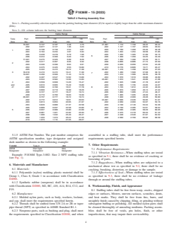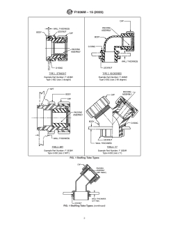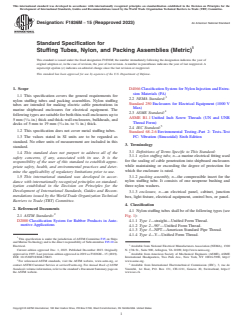 ASTM F1836M-15(2023) is a technical specification published by ASTM International. Its full title is "Standard Specification for Stuffing Tubes, Nylon, and Packing Assemblies (Metric)". This standard covers: ABSTRACT This specification covers the general requirements for nylon stuffing tubes and packing assemblies. Nylon stuffing tubes are intended for making electric cable penetrations in marine shipboard enclosures for electrical equipment. The following types are suitable for thin-wall enclosures up to a certain thickness and thick-wall enclosures, bulkheads, and decks of also of a certain thickness. Nylon stuffing tubes shall be classified into four types: Type 1 with straight, unified form thread, Type 2 with 90°, unified form thread, Type 3 with NPT, American standard pipe thread and Type 4 with Y, unified form thread. Materials used for the manufacture of these stuffing tubes and packing assemblies shall include polyamide or nylon and synthetic rubber or neoprene. The sizes and dimensions of stuffing tubes and packing assemblies are completely described. In order determine properties such as vibration resistance, ruggedness, and seal effectiveness of stuffing tubes, the following tests shall be performed: vibration test, mechanical abuse test, and level of effectiveness test. In terms of physical appearance, stuffing tubes shall be free from warp, cracks, chipped edges or surfaces, blisters, uneven surfaces, scratches, dents, and heat marks. They shall be free from fins, burrs, and unsightly finish caused by chipping, filing, or grinding without subsequent buffing or polishing. All molded nylon parts shall be cleaned thoroughly of annealing mediums. Packing assemblies shall be free of voids, pin holes, flash, or other imperfections, that may impair their serviceability. SCOPE 1.1 This specification covers the general requirements for nylon stuffing tubes and packing assemblies. Nylon stuffing tubes are intended for making electric cable penetrations in marine shipboard enclosures for electrical equipment. The following types are suitable for both thin-wall enclosures up to 5 mm (3/16 in.) thick and thick-wall enclosures, bulkheads, and decks of 5 mm to 19 mm (3/16 in. to 3/4 in.) thick. 1.2 This specification does not cover metal stuffing tubes. 1.3 The values stated in SI units are to be regarded as standard. No other units of measurement are included in this standard. 1.4 This standard does not purport to address all of the safety concerns, if any, associated with its use. It is the responsibility of the user of this standard to establish appropriate safety, health, and environmental practices and determine the applicability of regulatory limitations prior to use. 1.5 This international standard was developed in accordance with internationally recognized principles on standardization established in the Decision on Principles for the Development of International Standards, Guides and Recommendations issued by the World Trade Organization Technical Barriers to Trade (TBT) Committee.