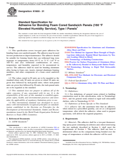 ASTM E1800-21 - Standard Specification for Adhesive for Bonding Foam Cored Sandwich Panels (160 °F Elevated Humidity Service), Type I Panels
