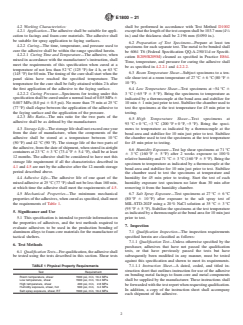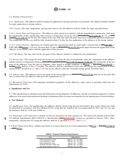 5.1 This specification is intended to provide information on the properties of adhesives, and the test methods required to evaluate adhesives to be used in the production bonding of aluminum alloys to foam core materials for the manufacture of tactical shelters.