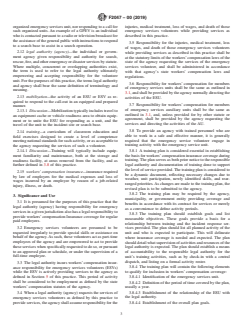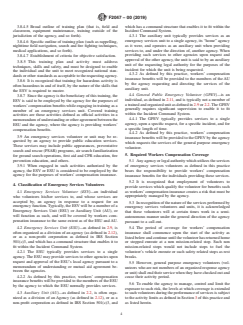 SIGNIFICANCE AND USE 3.1 It is presumed for the purposes of this practice that the legal authority (agency) having responsibility for emergency services in a given jurisdiction also has a legal responsibility to provide workers’ compensation Insurance coverage for regular paid employees. 3.2 Emergency services volunteers are presumed to be requested irregularly to provide special skills or assistance on behalf of the agency. As such, these volunteers act as part-time employees of the agency and are empowered to act to provide these services when specifically requested to do so, or pursuant to an approved plan or schedule, or under the supervision of a full-time employee. 3.3 The legal authority incurs workers’ compensation insurance responsibility for emergency services volunteers (ESVs) while the ESV is actively providing services to the agency as defined in Section 5 of this practice. This period of activity shall be considered to be employment as defined by the state workers’ compensation statutes of the agency. 3.4 When a legal authority (agency) requests the services of emergency services volunteers as defined by this practice to provide services, the agency shall assume responsibility for the injuries, medical treatment, loss of wages, and death of those emergency services volunteers while providing services as described in this practice. 3.5 Responsibility for the injuries, medical treatment, loss of wages, and death of those emergency services volunteers while providing services as described in this practice shall be at the statutory limits of the workers’ compensation laws of the state of the agency requesting the services of the emergency services volunteer, and shall be administered in accordance with that agency's state workers’ compensation laws and regulations. 3.6 Responsibility for workers’ compensation for members of emergency services units shall be the same as outlined in 3.1, and shall be provided by the agency normally directing the activities of the ... SCOPE 1.1 This practice defines the application of insurance benefits for emergency services volunteers and units in the manner and extent as provided for under the workers’ compensation statutes of the state in which the volunteer or unit provides services. 1.2 This practice identifies the basic types of emergency service volunteer, and the types of activities that should be covered by workers’ compensation insurance. 1.3 This practice includes both emergency service units who operate as organized resources to a public authority legally responsible for the provision of search and rescue and other emergency services, as well as those volunteers who respond to a general request to the public for their services. 1.4 This standard does not purport to address all of the safety concerns, if any, associated with its use. It is the responsibility of the user of this standard to establish appropriate safety, health, and environmental practices and determine the applicability of regulatory limitations prior to use. 1.5 This international standard was developed in accordance with internationally recognized principles on standardization established in the Decision on Principles for the Development of International Standards, Guides and Recommendations issued by the World Trade Organization Technical Barriers to Trade (TBT) Committee.