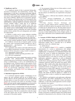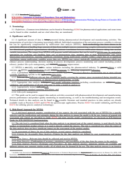 SIGNIFICANCE AND USE 4.1 A significant amount of data is generated during pharmaceutical development and manufacturing activities. The interpretation of such data is becoming increasingly difficult. Individual examination of the univariate process variables is relevant but can be significantly complemented by multivariate data analysis (MVDA). MVDA may be particularly appropriate for exploring and handling large sets of heterogenous data, mapping data of high dimensionality onto lower dimensional representations, exposing significant correlations among multivariate variables within a single data set or significant correlations among multivariate variables across data sets. MVDA may extract statistically significant information which may enhance process understanding, decision making in process development, process monitoring and control (including product release), product life-cycle management, and continuous improvement. 4.2 MVDA is widely used in various industries including the pharmaceutical industry. To achieve a valid outcome, an MVDA model/application should incorporate the following: 4.2.1 A predefined risk-based objective incorporating one or more relevant scientific hypotheses specific to the application; 4.2.2 Sufficient relevant data of requisite quality covering the variance space encountered during intended use, that is, pharmaceutical development, or pharmaceutical manufacturing, or both; 4.2.3 Appropriate data analysis and model utilization practices including considerations on testing, validation, and qualification of all new data prior to using a model to analyze it; 4.2.4 Appropriately trained staff; 4.2.5 Appropriate standard operating procedures; and 4.2.6 Life-cycle management. 4.3 This guide can be used to support data analysis activities associated with pharmaceutical development and manufacturing, process performance and product quality monitoring in manufacturing, as well as for troubleshooting and investigation events. Technical detai... SCOPE 1.1 This guide covers the applications of multivariate data analysis (MVDA) to support pharmaceutical development and manufacturing activities. MVDA is one of the key enablers for process understanding and decision making in pharmaceutical development, and for the release of intermediate and final products after being validated appropriately using a science and risk-based approach. 1.2 The scope of this guide is to provide general guidelines on the application of MVDA in the pharmaceutical industry. While MVDA refers to typical empirical data analysis, the scope is limited to providing a high level guidance and not intended to provide application-specific data analysis procedures. This guide provides considerations on the following aspects: 1.2.1 Use of a risk-based approach (understanding the objective requirements and assessing the fit-for-use status); 1.2.2 Considerations on the data collection and diagnostics used for MVDA (including data preprocessing and outliers); 1.2.3 Considerations on the different types of data analysis, model testing, and validation; 1.2.4 Qualified and competent personnel; and 1.2.5 Life-cycle management of MVDA model. 1.3 This standard does not purport to address all of the safety concerns, if any, associated with its use. It is the responsibility of the user of this standard to establish appropriate safety, health, and environmental practices and determine the applicability of regulatory limitations prior to use. 1.4 This international standard was developed in accordance with internationally recognized principles on standardization established in the Decision on Principles for the Development of International Standards, Guides and Recommendations issued by the World Trade Organization Technical Barriers to Trade (TBT) Committee.