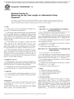 SIGNIFICANCE AND USE 2.1 This practice is to be used to measure the length of a specified dip tube from the bottom of the sealing surface to the end of the dip tube in a mechanical pump dispenser. 2.2 This practice is to be used to measure the exposed length of a specified dip tube of a mechanical pump dispenser. SCOPE 1.1 This practice covers the measurement technique for a dip tube of a mechanical pump dispenser. 1.2 The values stated in either SI units or inch-pound units are to be regarded separately as standard. The values stated in each system may not be exact equivalents; therefore, each system shall be used independently of the other. Combining values from the two systems may result in non-conformance with the standard. 1.3 This standard does not purport to address all of the safety concerns, if any, associated with its use. It is the responsibility of the user of this standard to establish appropriate safety, health, and environmental practices and determine the applicability of regulatory limitations prior to use. 1.4 This international standard was developed in accordance with internationally recognized principles on standardization established in the Decision on Principles for the Development of International Standards, Guides and Recommendations issued by the World Trade Organization Technical Barriers to Trade (TBT) Committee.