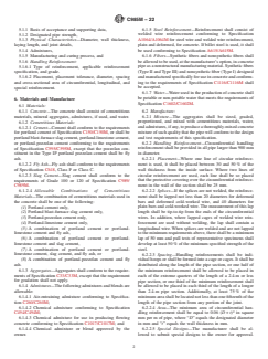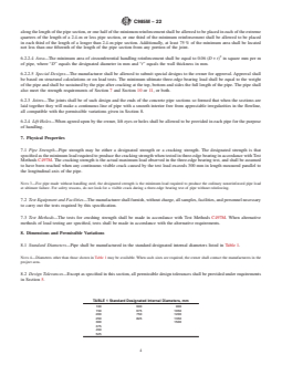 ABSTRACT This specification covers nonreinforced concrete pipe designed for specified strengths and intended to be used for the conveyance of sewage, industrial wastes, and storm water and for the construction of culverts. Strength test and load test shall be made in accordance with the specified requirements. SCOPE 1.1 This specification covers nonreinforced concrete pipe designed for specified strengths and intended to be used for the conveyance of sewage, industrial wastes, and storm water and for the construction of culverts. 1.2 This specification is the metric counterpart of Specification C985. Note 1: This specification is a manufacturing and purchase specification only and does not include requirements for bedding, backfill, or the relationship between field load conditions and the designated strength of the pipe. However, experience has shown that the successful performance of this product depends upon the proper selection of the pipe strength, type of bedding and backfill, and care that the installation conforms to the construction specifications. The owner of the concrete pipe specified herein is cautioned that he must correlate the field requirements with the pipe strength specified and provide inspection at the construction site. 1.3 This international standard was developed in accordance with internationally recognized principles on standardization established in the Decision on Principles for the Development of International Standards, Guides and Recommendations issued by the World Trade Organization Technical Barriers to Trade (TBT) Committee.