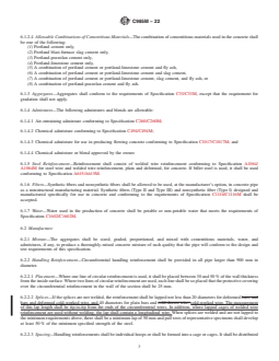 ASTM C985M-22 is a technical specification published by ASTM International. Its full title is "Standard Specification for Nonreinforced Concrete Specified Strength Culvert, Storm Drain, and Sewer Pipe (Metric)". This standard covers: ABSTRACT This specification covers nonreinforced concrete pipe designed for specified strengths and intended to be used for the conveyance of sewage, industrial wastes, and storm water and for the construction of culverts. Strength test and load test shall be made in accordance with the specified requirements. SCOPE 1.1 This specification covers nonreinforced concrete pipe designed for specified strengths and intended to be used for the conveyance of sewage, industrial wastes, and storm water and for the construction of culverts. 1.2 This specification is the metric counterpart of Specification C985. Note 1: This specification is a manufacturing and purchase specification only and does not include requirements for bedding, backfill, or the relationship between field load conditions and the designated strength of the pipe. However, experience has shown that the successful performance of this product depends upon the proper selection of the pipe strength, type of bedding and backfill, and care that the installation conforms to the construction specifications. The owner of the concrete pipe specified herein is cautioned that he must correlate the field requirements with the pipe strength specified and provide inspection at the construction site. 1.3 This international standard was developed in accordance with internationally recognized principles on standardization established in the Decision on Principles for the Development of International Standards, Guides and Recommendations issued by the World Trade Organization Technical Barriers to Trade (TBT) Committee.