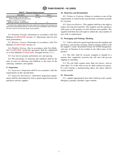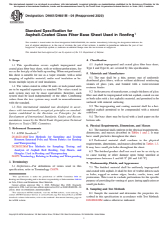 ASTM D4601/D4601M-04(2020) is a technical specification published by ASTM International. Its full title is "Standard Specification for Asphalt-Coated Glass Fiber Base Sheet Used in Roofing". This standard covers: ABSTRACT This specification covers the standards for asphalt impregnated and coated glass fiber base sheet intended for use as the first ply of built-up roofings. This sheets are also suitable for use as a vapor retarded under roof insulation or between multiple layers of roof insulation. The materials shall conform to the physical requirements, dimensions, and masses prescribed herein. The products shall not crack nor be too sticky as to cause damage upon being unrolled. The specimen shall also undergo testing to determine the following properties: breaking strength, moisture content, and pliability. SCOPE 1.1 This specification covers asphalt impregnated and coated glass fiber base sheet, with or without perforations, for use as the first ply of the built-up roofing. When not perforated, this sheet is suitable for use as a vapor retarder, with a solid mopping of asphaltic material, under roof insulation or between multiple layers of roof insulation. 1.2 The values stated in either SI units or inch-pound units are to be regarded separately as standard. The values stated in each system may not be exact equivalents; therefore, each system shall be used independently of the other. Combining values from the two systems may result in nonconformance with the standard. 1.3 This international standard was developed in accordance with internationally recognized principles on standardization established in the Decision on Principles for the Development of International Standards, Guides and Recommendations issued by the World Trade Organization Technical Barriers to Trade (TBT) Committee.