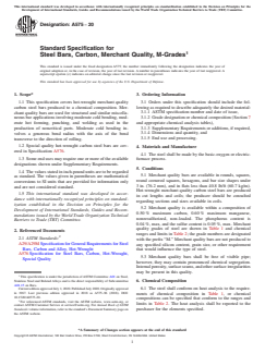 ABSTRACT This specification covers M-grade hot-wrought merchant quality carbon steel bars produced to a chemical composition. Merchant quality bars are used for structural and similar miscellaneous bar applications involving moderate cold bending, moderate hot forming, punching, and welding as used in the production of noncritical parts. Moderate cold bending involves generous bend radius with the axis of the bend transverse to the direction of rolling. Heat analysis shall conform to the requirements as to chemical composition. SCOPE 1.1 This specification covers hot-wrought merchant quality carbon steel bars produced to a chemical composition. Merchant quality bars are used for structural and similar miscellaneous bar applications involving moderate cold bending, moderate hot forming, punching, and welding as used in the production of noncritical parts. Moderate cold bending involves a generous bend radius with the axis of the bend transverse to the direction of rolling. 1.2 Special quality hot-wrought carbon steel bars are covered in Specification A576. 1.3 Some end uses may require one or more of the available designations shown under Supplementary Requirements. 1.4 The values stated in inch-pound units are to be regarded as standard. The values given in parentheses are mathematical conversions to SI units that are provided for information only and are not considered standard. 1.5 This international standard was developed in accordance with internationally recognized principles on standardization established in the Decision on Principles for the Development of International Standards, Guides and Recommendations issued by the World Trade Organization Technical Barriers to Trade (TBT) Committee.