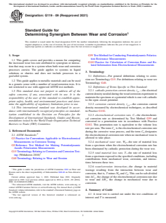 SIGNIFICANCE AND USE 5.1 Wear and corrosion can involve a number of mechanical and chemical processes. The combined action of these processes can result in significant mutual interaction beyond the individual contributions of mechanical wear and corrosion (1-5).4 This interaction among abrasion, rubbing, impact and corrosion can significantly increase total material losses in aqueous environments, thus producing a synergistic effect. Reduction of either the corrosion or the wear component of material loss may significantly reduce the total material loss. A practical example may be a stainless steel that has excellent corrosion resistance in the absence of mechanical abrasion, but readily wears and corrodes when abrasive particles remove its corrosion-resistant passive film. Quantification of wear/corrosion synergism can help guide the user to the best means of lowering overall material loss. The procedures outlined in this guide cannot be used for systems in which any corrosion products such as oxides are left on the surface after a test, resulting in a possible weight gain. SCOPE 1.1 This guide covers and provides a means for computing the increased wear loss rate attributed to synergism or interaction that may occur in a system when both wear and corrosion processes coexist. The guide applies to systems in liquid solutions or slurries and does not include processes in a gas/solid system. 1.2 This guide applies to metallic materials and can be used in a generic sense with a number of wear/corrosion tests. It is not restricted to use with approved ASTM test methods. 1.3 This standard does not purport to address all of the safety concerns, if any, associated with its use. It is the responsibility of the user of this standard to establish appropriate safety, health, and environmental practices and determine the applicability of regulatory limitations prior to use. 1.4 This international standard was developed in accordance with internationally recognized principles on standardization established in the Decision on Principles for the Development of International Standards, Guides and Recommendations issued by the World Trade Organization Technical Barriers to Trade (TBT) Committee.