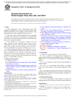 ASTM B164-03(2019) is a technical specification published by ASTM International. Its full title is "Standard Specification for Nickel-Copper Alloy Rod, Bar, and Wire". This standard covers: ABSTRACT This specification covers nickel-copper alloys UNS N04400 and N04405 in the form of hot-worked and cold-worked rod, bar, and wire. The material shall conform to the chemical composition limits specified by the reference material. The materials for rod, bar, or wire shall conform to the mechanical properties specified by the reference material. One test per lot shall be performed for chemical analysis, tension test, hardness test, and wrapping test. SCOPE 1.1 This specification2 covers nickel-copper alloys UNS N04400 and N044053 in the form of hot-worked and cold-worked rod and bar in the conditions shown in Table 1 and cold-worked wire in the conditions shown in Table 2. 1.2 The values stated in inch-pound units are to be regarded as standard. The values given in parentheses are mathematical conversions to SI units that are provided for information only and are not considered standard. 1.3 This standard does not purport to address all of the safety concerns, if any, associated with its use. It is the responsibility of the user of this standard to establish appropriate safety, health, and environmental practices and determine the applicability of regulatory limitations prior to use. 1.4 This international standard was developed in accordance with internationally recognized principles on standardization established in the Decision on Principles for the Development of International Standards, Guides and Recommendations issued by the World Trade Organization Technical Barriers to Trade (TBT) Committee.