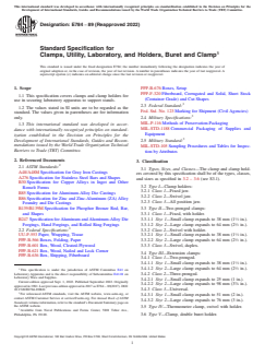 ASTM E784-89(2022) is a technical specification published by ASTM International. Its full title is "Standard Specification for Clamps, Utility, Laboratory, and Holders, Buret and Clamp". This standard covers: ABSTRACT This specification covers clamps and clamp holders for use in securing laboratory apparatus to support stands. The clamp and clamp holders are classified into types, sizes and classes and are presented in details. Clamps and clamp holders shall be manufactured from aluminum-base alloy, zinc-base alloy, or cast iron. Fittings such as screws, nuts, and rivets for clamps and clamp holders shall be forged aluminum or chemical-resistant alloy for either aluminum-base alloy or zinc-base alloy clamps and clamp holders. Component springs of clamps shall be phosphor bronze or corrosion-resistant steel. Component sleeves of clamps may be rubber, plastic, fiber glass, non-hazardous minerals, or replaceable plastic. SCOPE 1.1 This specification covers clamps and clamp holders for use in securing laboratory apparatus to support stands. 1.2 The values stated in SI units are to be regarded as the standard. The values given in parentheses are for information only. 1.3 This international standard was developed in accordance with internationally recognized principles on standardization established in the Decision on Principles for the Development of International Standards, Guides and Recommendations issued by the World Trade Organization Technical Barriers to Trade (TBT) Committee.
