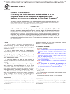 ASTM E3364-22 is a standard published by ASTM International. Its full title is "Standard Test Method for Evaluating the Performance of Antimicrobials in or on Polymeric Porous and Nonporous Materials Against Staining by <emph type="ital" >Streptomyces</emph> species (A Pink Stain Organism)". This standard covers: SIGNIFICANCE AND USE 5.1 Methods such as D3273 Standard Test Method for Resistance to Growth of Mold on the Surface of Interior Coatings in an Environmental Chamber and D3274 Standard Test Method for Evaluating the Degree of Surface Disfigurement of Paint Films by Fungal or Algal Growth or Soil or Dirt Accumulation provide means for assessing mold and algal staining on paints. The Test Method E1428 Evaluating the Performance of Antimicrobials in or on Polymeric Solids Against Staining by Streptomyces species (A Pink Stain Organism) is used for solid polymeric materials, but is not appropriate for all antimicrobial technologies. 5.2 This test method provides a technique for evaluating antimicrobials in or on polymeric materials against staining by Streptomyces species and should assist in the prediction of performance of treated articles under actual field conditions. SCOPE 1.1 This test method is intended to assess susceptibility of polymer materials, as well as products that may directly contact the treated polymer, to staining by the Actinomycete Streptomyces species. 1.2 This test method is also suitable for evaluating dark-pigmented test samples since the bacterial growth inhibition can be assessed. 1.3 Familiarity with microbiological techniques is required. This test method should not be used by persons without at least basic microbiological training. 1.4 The values stated in SI units are to be regarded as standard. No other units of measurement are included in this standard. 1.5 This standard does not purport to address all of the safety concerns, if any, associated with its use. It is the responsibility of the user of this standard to establish appropriate safety, health, and environmental practices and determine the applicability of regulatory limitations prior to use. 1.6 This international standard was developed in accordance with internationally recognized principles on standardization established in the Decision on Principles for the Development of International Standards, Guides and Recommendations issued by the World Trade Organization Technical Barriers to Trade (TBT) Committee.