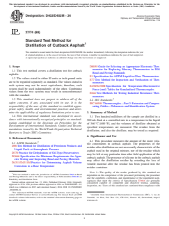 ASTM D402/D402M-24: Standard Test Method for Distillation of Cutback Asphalt is an internationally recognized standard developed by ASTM International. This test method is designed to determine the amount of volatile constituents in cutback asphalts through a controlled distillation process. By evaluating the distillation residue, the procedure aids in quality control and ensures materials meet specifications for use in road construction and paving applications.