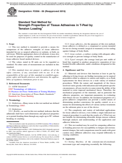 SIGNIFICANCE AND USE 4.1 Materials and devices that function at least in part by adhering to living tissues are finding increasing use in surgical procedures either as adjuncts to sutures and staples, or as frank replacements for those devices in a wide variety of medical procedures. While the nature and magnitude of the forces involved varies greatly with indication and with patient specific circumstances, all uses involve to some extent the ability of the material to resist imposed mechanical forces. Therefore, the mechanical properties of the materials, and in particular the adhesive properties, are important parameters in evaluating their fitness for use. In addition, the mechanical properties of a given adhesive composition can provide a useful means of determining product consistency for quality control, or as a means for determining the effects of various surface treatments on the substrate prior to use of the device. 4.2 The complexity and variety of individual applications for tissue adhesive devices, even within a single indicated use (surgical procedure) is such that the results of a T-Peel test are not suitable for determining allowable design stresses without thorough analysis and understanding of the application and adhesive behaviors. 4.3 This test method may be used for comparing adhesives or bonding processes for susceptibility to fatigue and environmental changes, but such comparisons must be made with great caution since different adhesives may respond differently to varying conditions. SCOPE 1.1 This test method is intended to provide a means for comparison of the adhesive strengths of tissue adhesives intended for use as surgical adhesives or sealants, or both, on soft tissue. With the appropriate choice of substrate, it may also be used for purposes of quality control in the manufacture of tissue adhesive based medical devices. 1.2 The values stated in SI units are to be regarded as standard. No other units of measurement are included in this standard. 1.3 This standard does not purport to address all of the safety concerns, if any, associated with its use. It is the responsibility of the user of this standard to establish appropriate safety and health practices and determine the applicability of regulatory limitations prior to use.