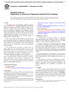 ASTM D3805/D3805M-16(2023) is a guide published by ASTM International. Its full title is "Standard Guide for Application of Aluminum-Pigmented Asphalt Roof Coatings". This standard covers: SIGNIFICANCE AND USE 3.1 Asphalt-based, solvent-type, fibered or nonfibered, aluminum-pigmented roof coatings are used as a protective coating for solar reflection to prolong the life of roofing materials or where decorative qualities are desired. 3.2 Suitable application of aluminum-pigmented asphalt roof coatings is an important factor in achieving a successful long-term coating. Suitable application is, in part, dependent upon appropriate specifications to guide the work. This guide can be useful in facilitating development of an appropriate specification for surface preparation and application of the roof coating. 3.3 Designers/specifiers of coatings may use this guide in preparing the application portion of their specification. Contractors working directly for the building owner may also use this guide. 3.4 This guide is not all-inclusive. Manufacturer's application instructions should be consulted and geographical “area practices” considered. Consult membrane manufacturer and coating manufacturer for acceptability of procedures and products. SCOPE 1.1 This guide covers the application methods for Specification D2824/D2824M Aluminum-Pigmented Asphalt Roof Coatings, Nonfibered, and Fibered without Asbestos, for application on asphalt built-up roof membranes, modified bitumen roof membranes, bituminous base flashings, concrete surfaces, metal surfaces, emulsion coatings, and solvent-based coatings. This guide does not apply to the selection of a specific aluminum-pigmented asphalt roof coating type for use on specific projects. The fibered version of these coatings excludes the use of asbestos fibers. 1.2 The values stated in either SI units or inch-pound units are to be regarded separately as standard. The values stated in each system may not be exact equivalents; therefore, each system shall be used independently of the other. Combining values from the two systems may result in nonconformance with the standard. 1.3 This standard does not purport to address all of the safety concerns, if any, associated with its use. It is the responsibility of the user of this standard to establish appropriate safety, health, and environmental practices and determine the applicability of regulatory limitations prior to use. Specific precautionary statements are given in Section 4. 1.4 This international standard was developed in accordance with internationally recognized principles on standardization established in the Decision on Principles for the Development of International Standards, Guides and Recommendations issued by the World Trade Organization Technical Barriers to Trade (TBT) Committee.